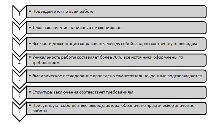 Наличие ссылок: если для основного текста диссертации ссылки являются важным условием, то для заключения лучше не использовать цитирование и пересказ других источников. В заключении магистрант подводит итоги своей работы и главное требование – авторство и уникальность.